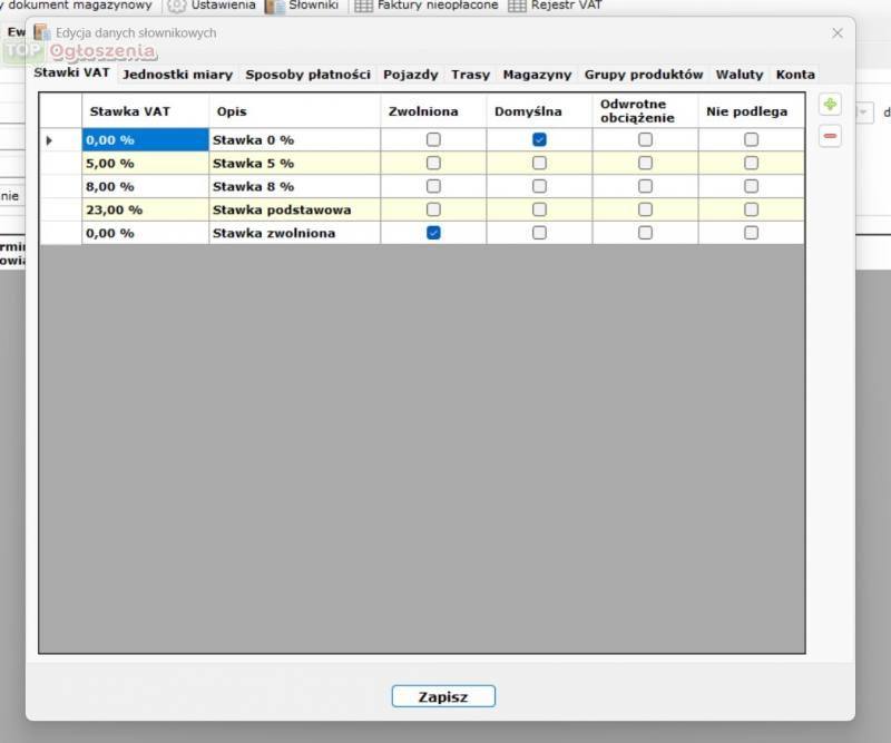 Definiowalne słowniki ułatwiające wprowadzanie danych (stawki VAT, jednostki miary, sposoby płatności, trasy)
